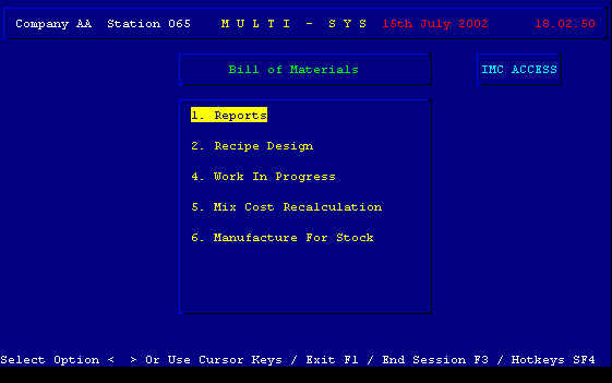 The Bill of Materials main menu is generated dynamically based on the user authorisation level.