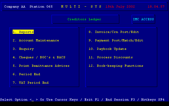 The Creditor's Ledger main menu is generated dynamically based on the user authorisation level.