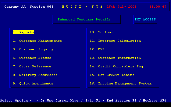 The Customer's Database main menu is generated dynamically based on user authorisation level.